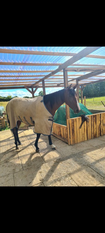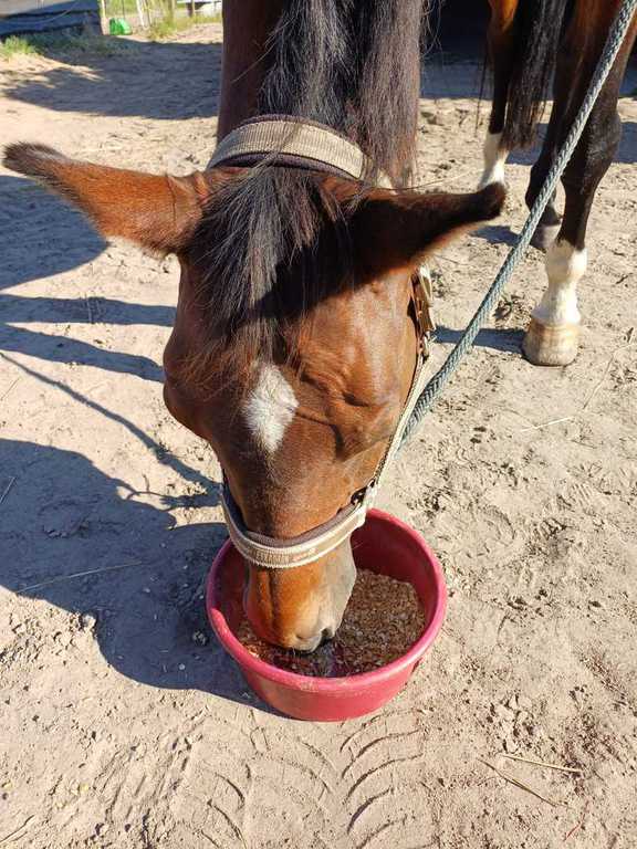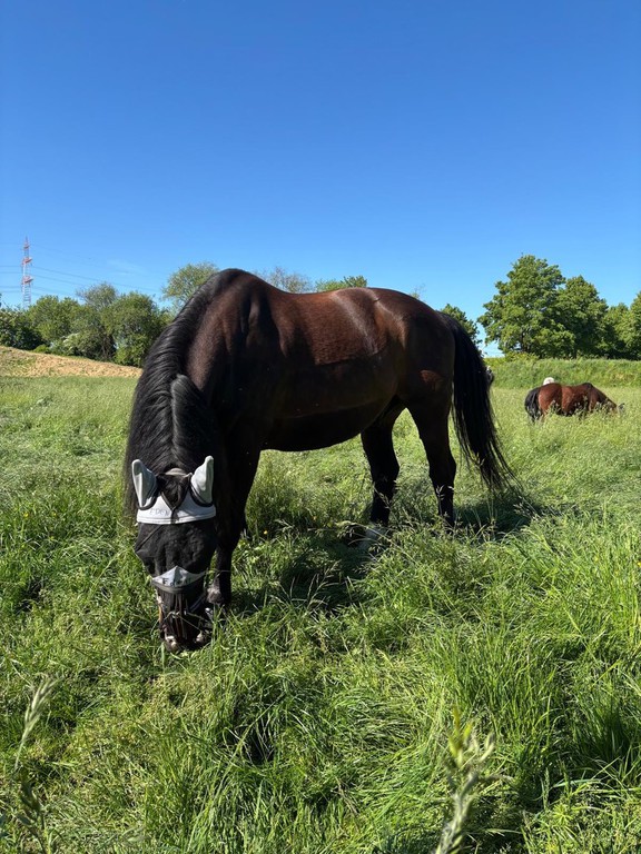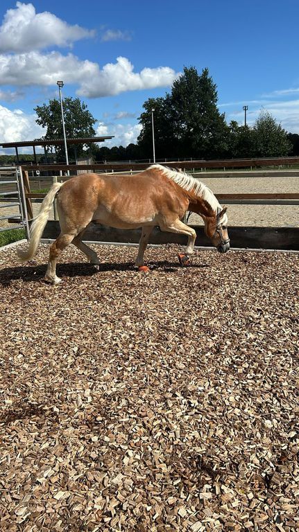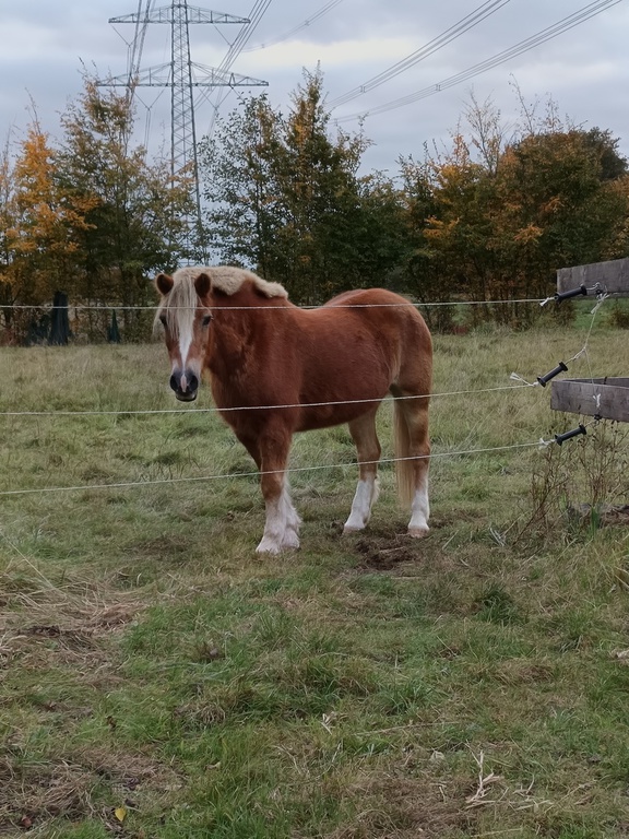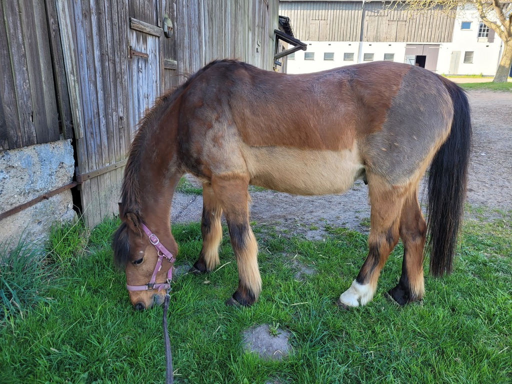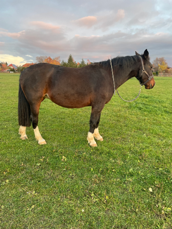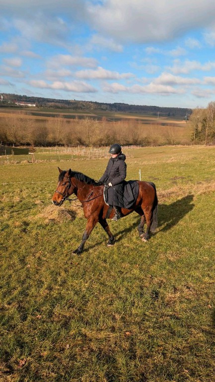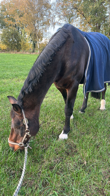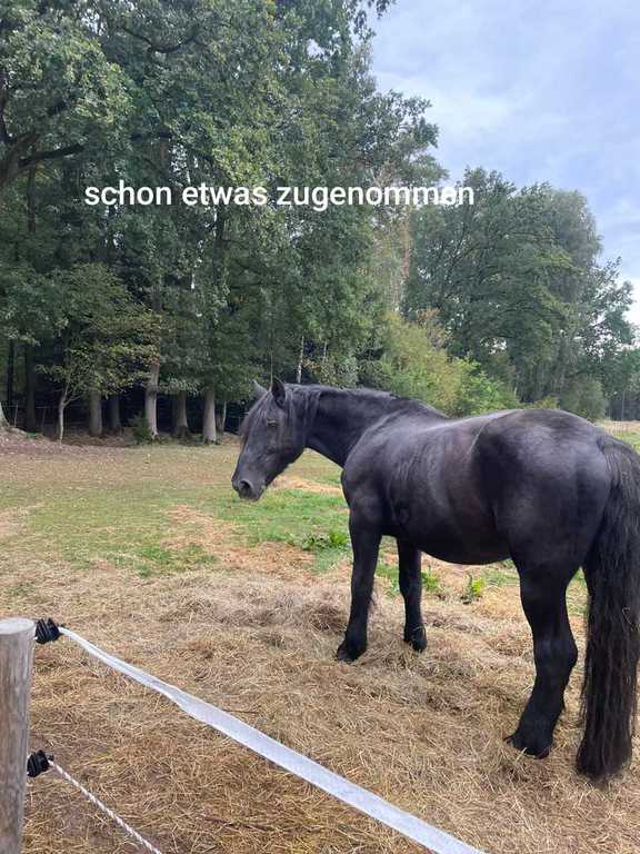 Man sollte beachten, dass er sehr leichtfuttrig ist. Durch die lange Beschäftigungspause hat er zugenommen. Rein auf die Weide kann er nicht. Halbtags mit Fressbremse hat gut geklappt.