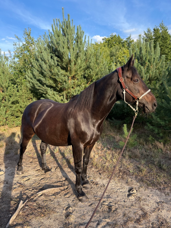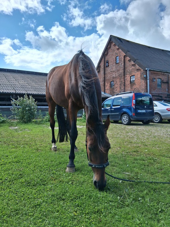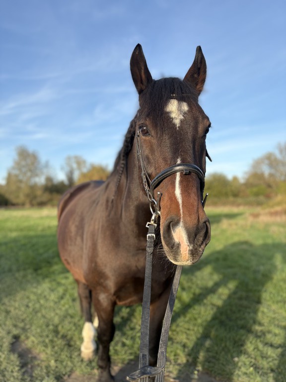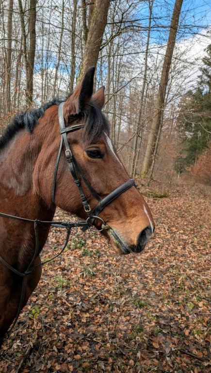 Lukas ist aktuell etwas zu gut im Futter – typisch Warmblut – und freut sich über jemanden, der ihm hilft, wieder in Form zu kommen. Er kann schon mal ein bisschen stur sein, wenn er keinen Sinn in einer Aufgabe sieht, bleibt dabei aber immer freundlich und respektvoll.