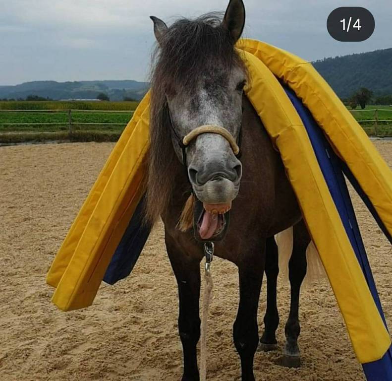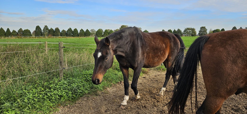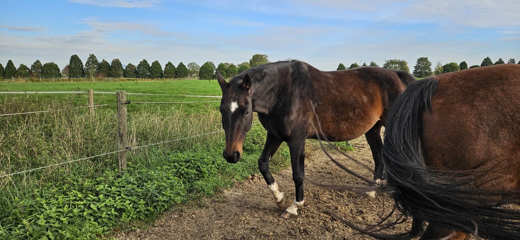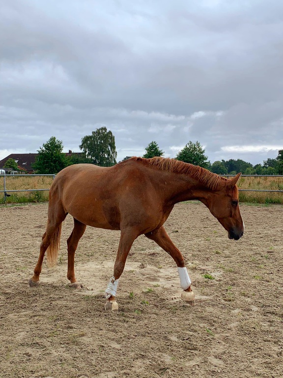 Leider ist er seit 3 1/2 Jahren ca. lahm. Ich habe alles versucht, er war bei verschiedenen Tierärzten und Osteopathen, und auch in der Klinik für ein MRT. Geröntgt wurde er mehrfach. Die Diagnose war Knochenödem im Strahlbein vorne rechts. Das haben wir behandelt. Leider hat er danach trotz schonendem Aufbauprogramm wieder mit dem Lahmen angefangen. Nachdem der Fachtierarzt für Lahmheiten nicht weiter wusste, stand er jetzt die letzten Jahre nur auf der Weide, und wir sind spazieren gegangen.