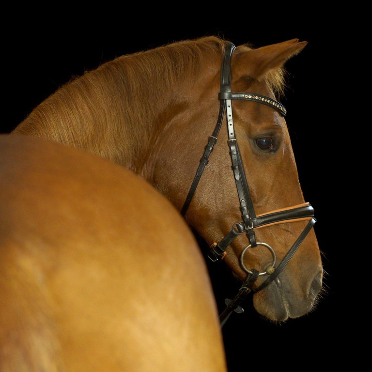 Leider hat er Facettengelenksarthrose C6/7, die linke Seite ist erfolgreich operiert, die rechte konnte nicht mehr gemacht werden, weil er ohne Bezugsperson in der Klinik zusammengebrochen ist. Letzten Winter war er voll reitbar auf sicherem L-Niveau mit Traversalen, den Sommer war er viel auf der Weide, er hat Hochs und Tiefs. Er geht allein ins Gelände, sehr lange oder schnelle Ausritte sind allerdings nicht gut für den Hals. Er wird auch am Boden gearbeitet, hat innerhalb von 30 Minuten piaffieren gelernt, kann spanischen Schritt, Seitengänge.