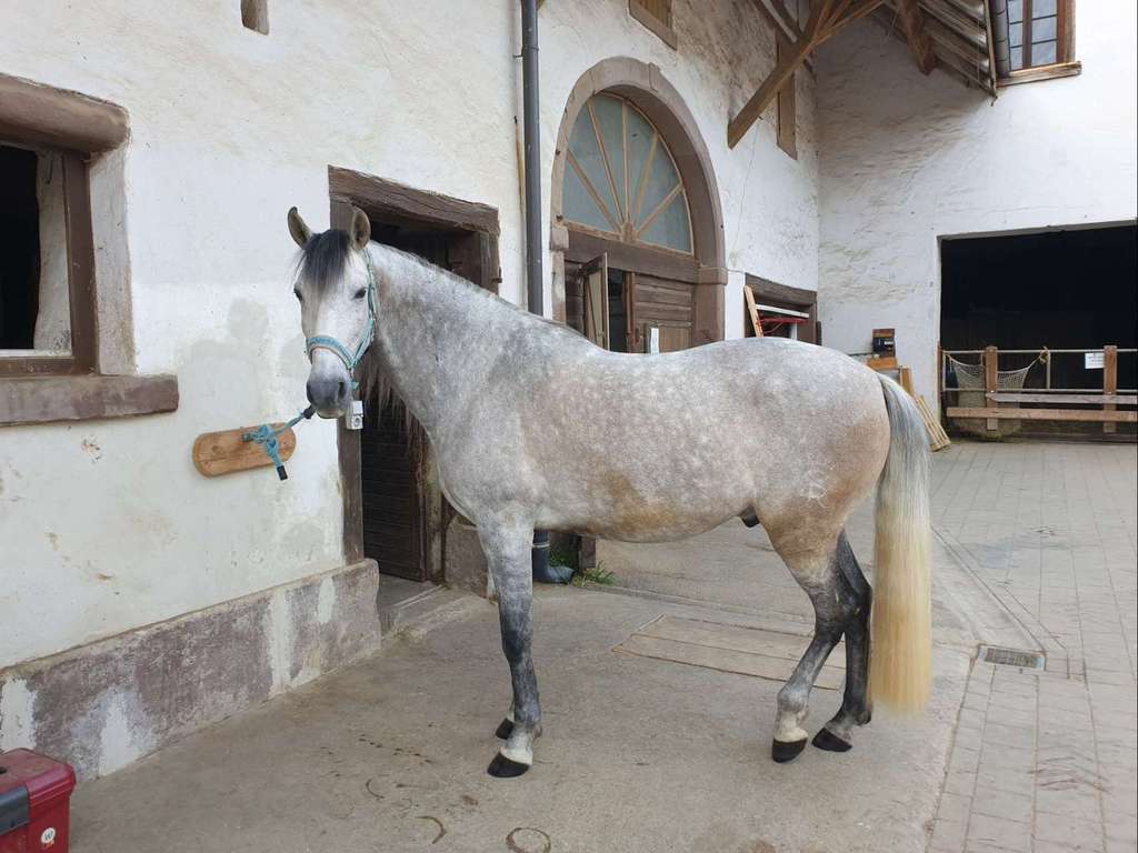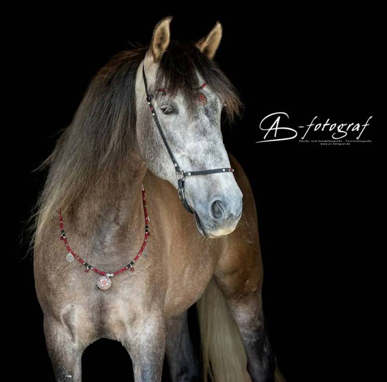 Dalo ist 10 Jahre alt, 1,71m groß, PRE (Andalusier), intelligent, neugierig, selbstbewusst und mutig. Manchmal frech, aber auch verschmust und fragt aktiv nach Streicheleinheiten.
